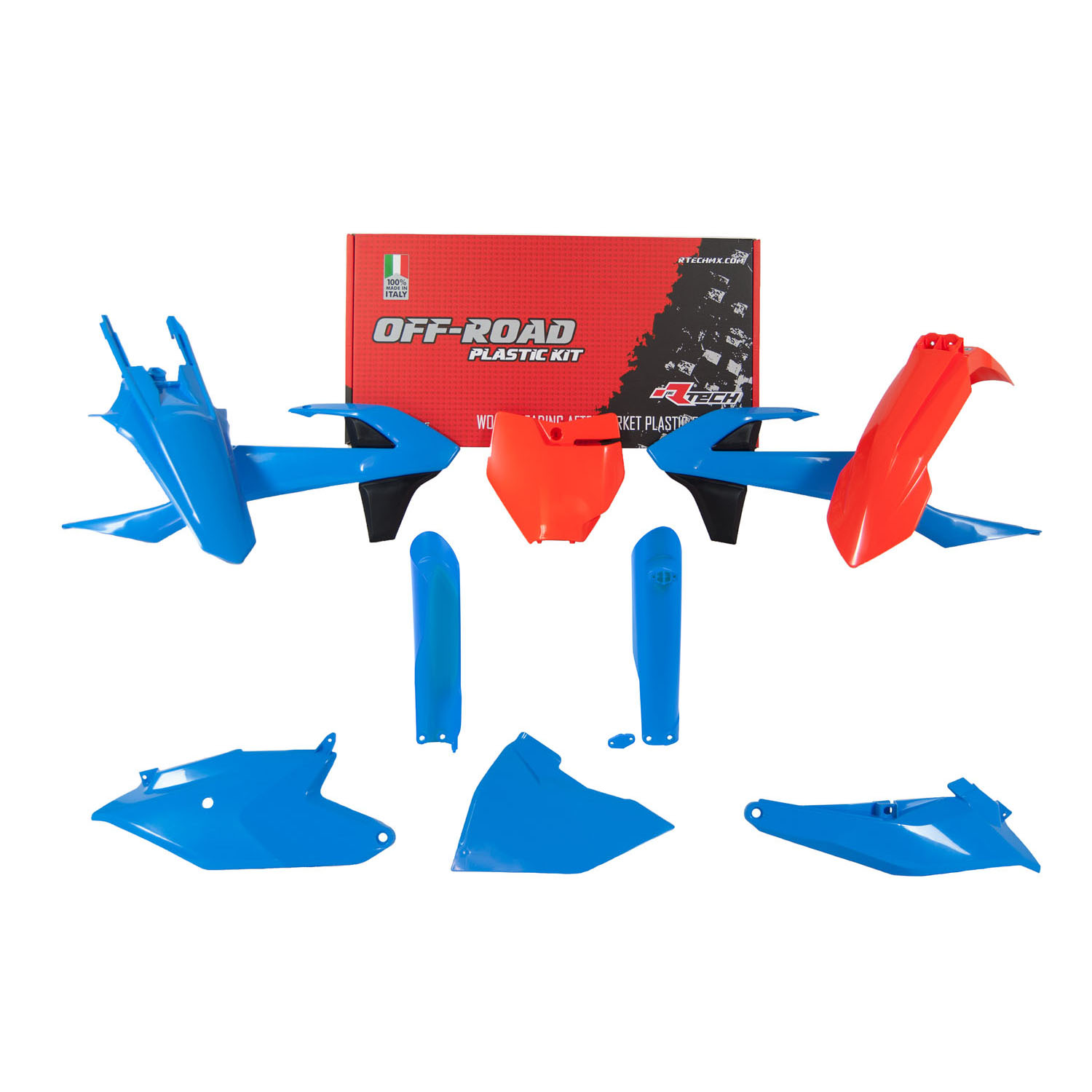 KIT PLASTICHE 7 PEZZI CON COPERCHIO CASSA FILTRO KTM REPLICA ARANCIONE-AZZURRO VINTAGE