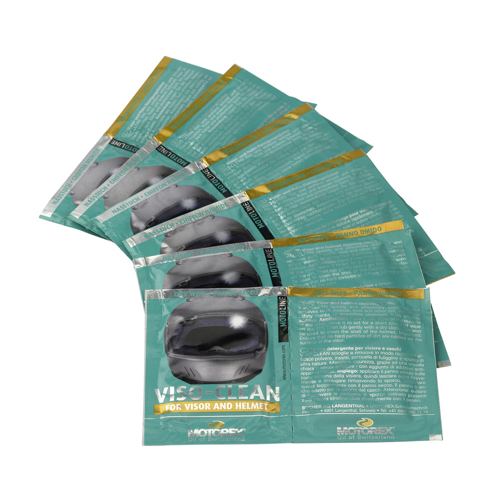 MOTOREX VISO-CLEAN Salviettine per la pulizia di visiera e casco. VISOCLEAN scioglie velocemente ed in modo efficace sporco, germi, olio e fuliggine. Prodotto sicuro grazie ad una formula che permette una chiara visuale e una protezione contro l’appannamento. Composto da una salviettina umidificata per rimuovere lo sporco e da una asciutta per lucidare.