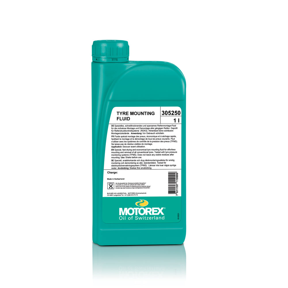 MOTOREX TYRE MOUNTING FLUID Fluido speciale economico per il montaggio di pneumatici ad asciugatura rapida. Testato per sistemi di monitoraggio della pressione dei pneumatici (TPMS). Non lascia residui visibili di montaggio. Il TMF DISPENSER 300ml è disponibile come accessorio.