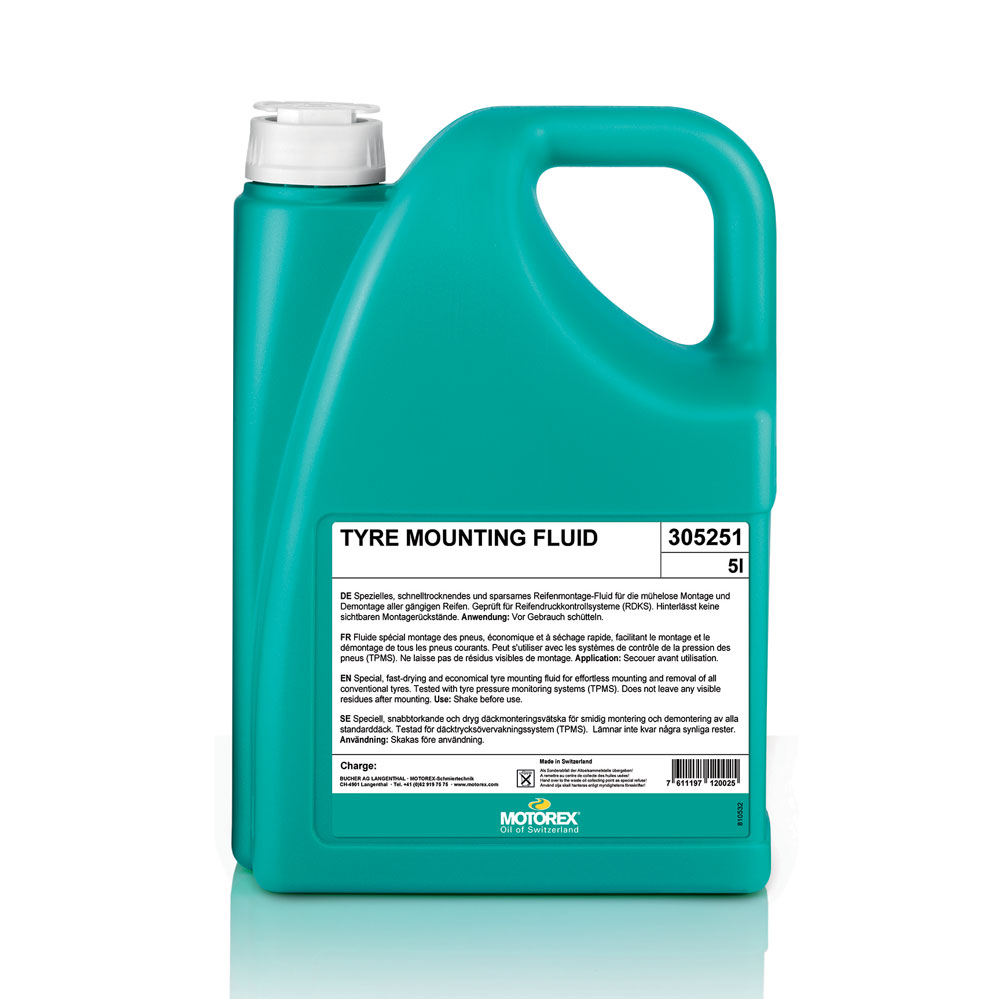 MOTOREX TYRE MOUNTING FLUID Fluido speciale economico per il montaggio di pneumatici ad asciugatura rapida. Testato per sistemi di monitoraggio della pressione dei pneumatici (TPMS). Non lascia residui visibili di montaggio. Il TMF DISPENSER 300ml è disponibile come accessorio.