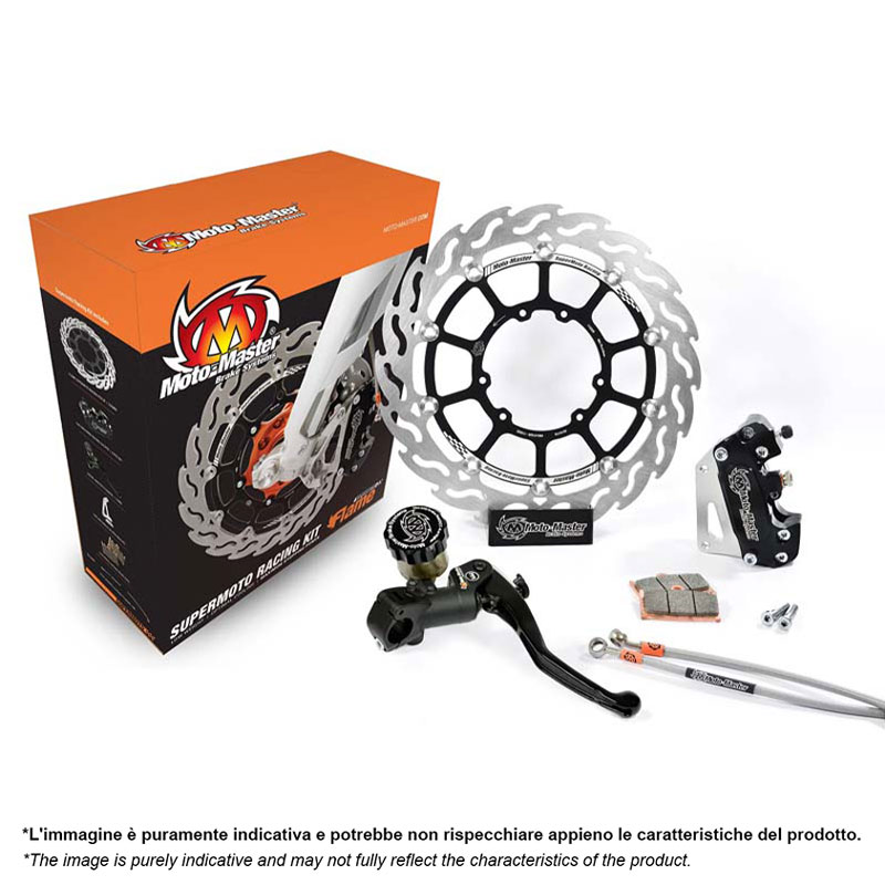 Se è la massima potenza di arresto che cerchi, il kit Racing Flame SuperSport è quello che fa per te. Il kit Moto-Master Flame Supermoto Racing combina tutti insieme i migliori prodotti Moto-Master Supermoto. Questo kit è stato sviluppato appositamente per le gare di Supermoto. Disponibile con disco freno di dimensioni 300mm o 320mm.