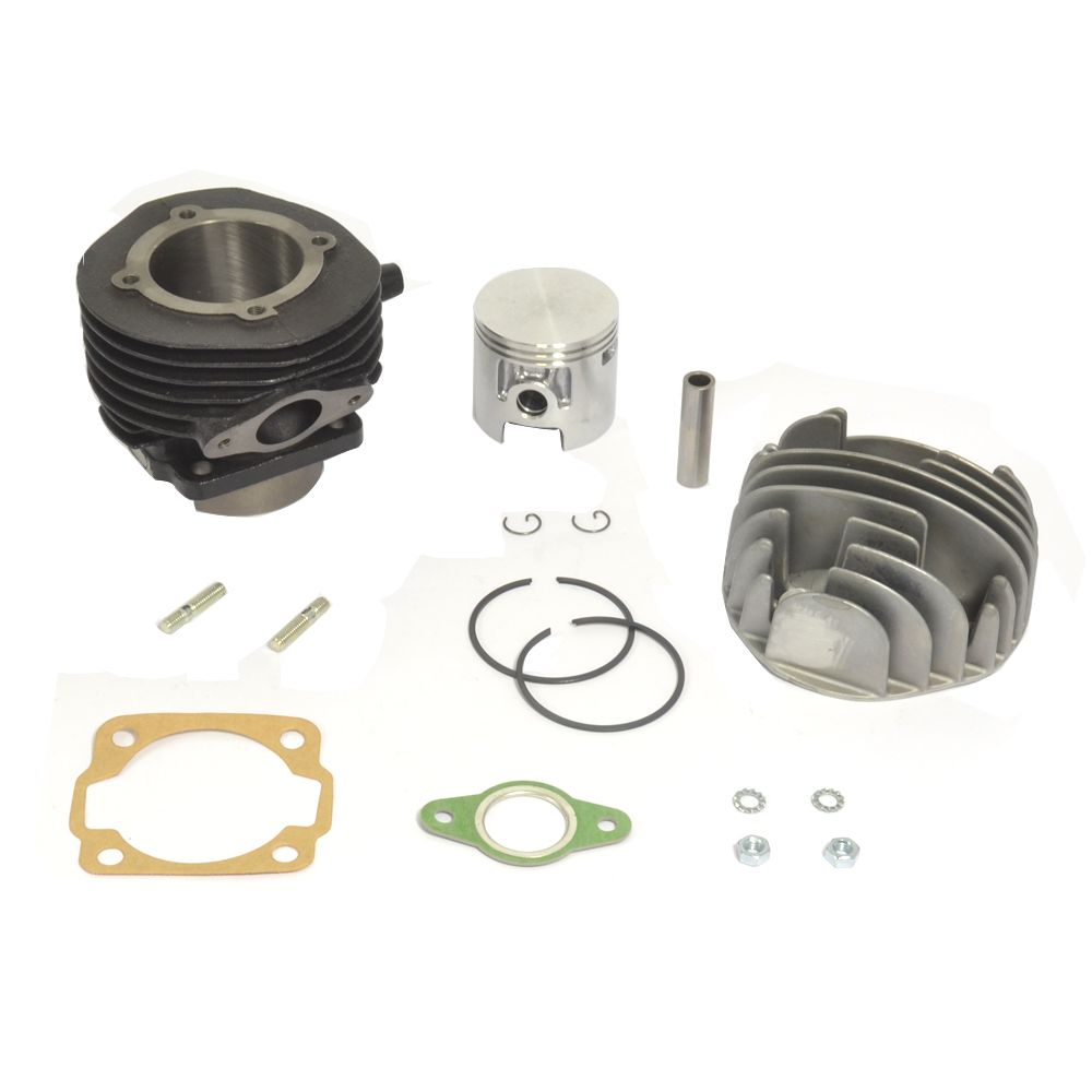 The kit includes the high-quality cast iron cylinder with increased bore, the cylinder head, the complete piston with the piston pin and rings, and all the necessary gaskets.