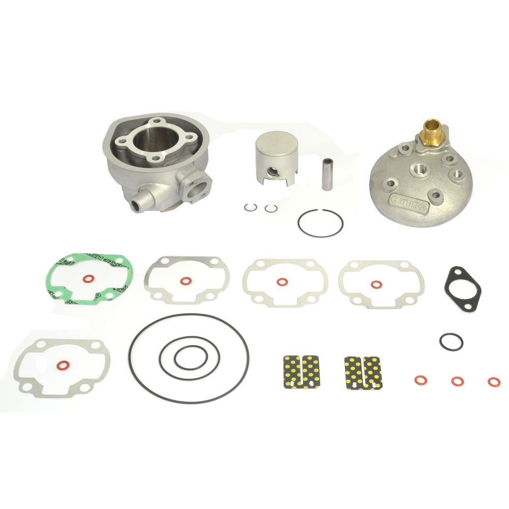 The kit includes the high-quality aluminum cylinder with increased bore, the cylinder head, the piston with flat head with the piston pin and rings, and all the necessary gaskets.