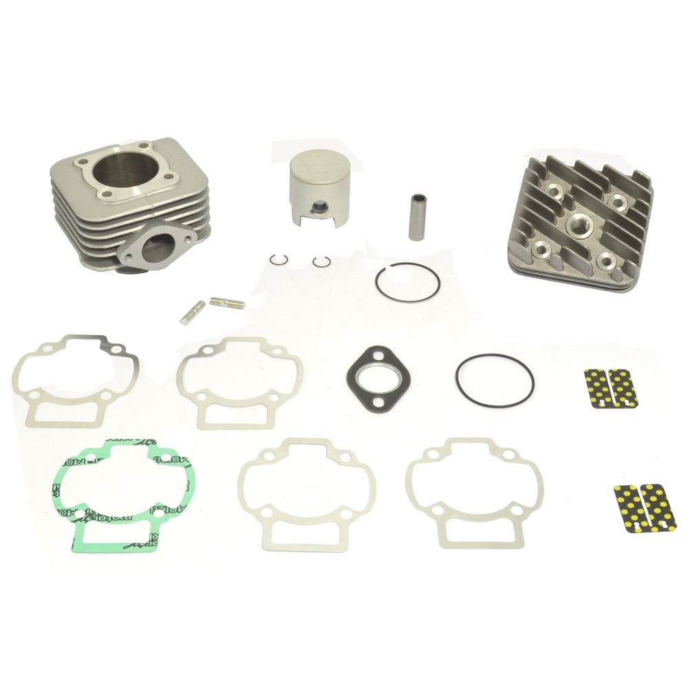 The kit includes the high-quality aluminum cylinder with increased bore, the cylinder head, the piston with flat head with the piston pin and rings, and all the necessary gaskets.