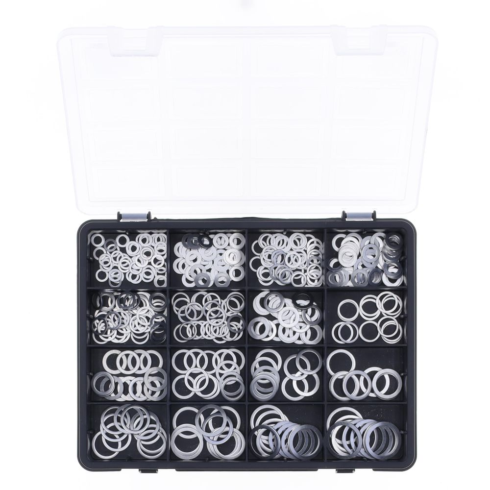 Athena aluminium washers kit includes 16 different sizes with various diameters and thicknesses. Wahsers are the simplest and economical solution for tightening or sealing problems. High precision, quality and good deformability offers the best stability with standard pressures.This assorted kit is provided with a solid box with compartments.