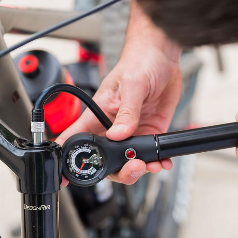 Inflate tyres and optimise suspension. The Dualpressure suspension pump does both with a high and low pressure option. The pressure gauge and pressure release allow you to easily achieve the desired pressure.