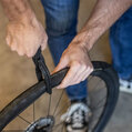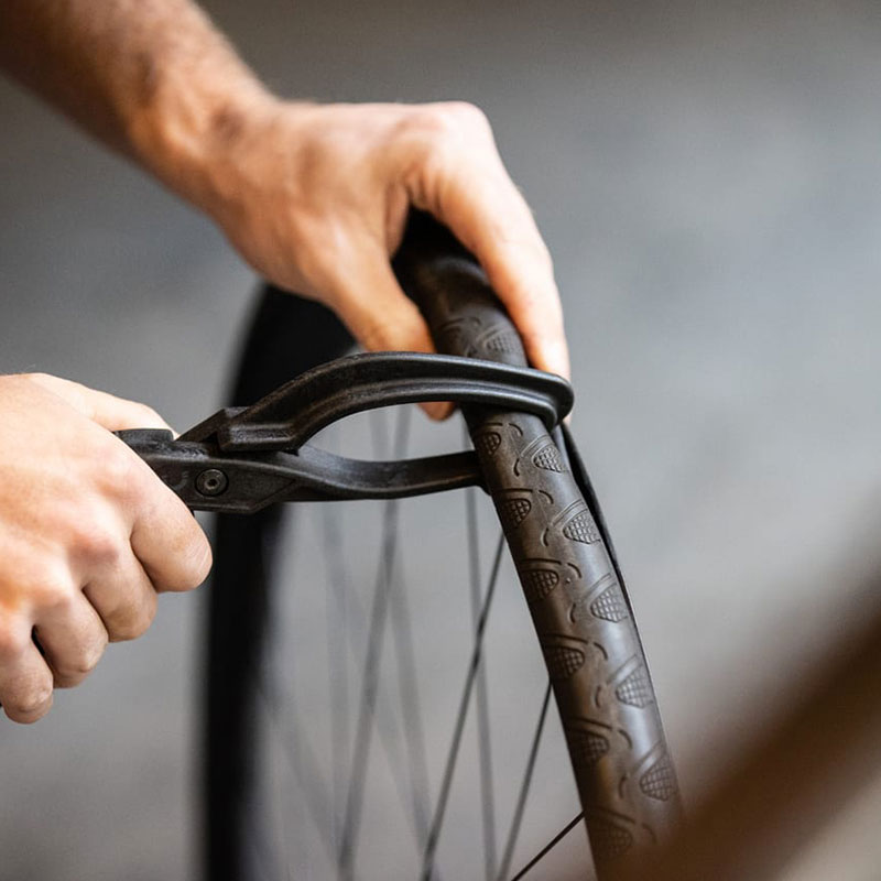 Normal tyre levers can be quite annoying. They're fine for use on bikes, but when working in a workshop, it's better to have something more practical. EasyTire is a super handy tool for removing tyres from rims. Simply place EasyTire on the rim and tyre, press down and you're done. EasyTire is made of composite material to ensure that neither the tyre nor the rim is damaged.